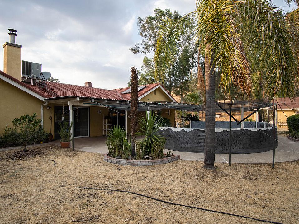 This hill-top home is situated in a wooded area with stunning landscape, including many large boulders. It features a Paid solar system installed in 2020 with 20 high-efficiency rooftop panels, providing most of the electricity for this all-electric home. The property includes several fenced and gated pastures for horses and cattle, complete with water feeders and a small hay barn. On the west side of the home, there is a picnic area with a brick fire pit and a bench-style table. The house also includes a built-in swimming pool.