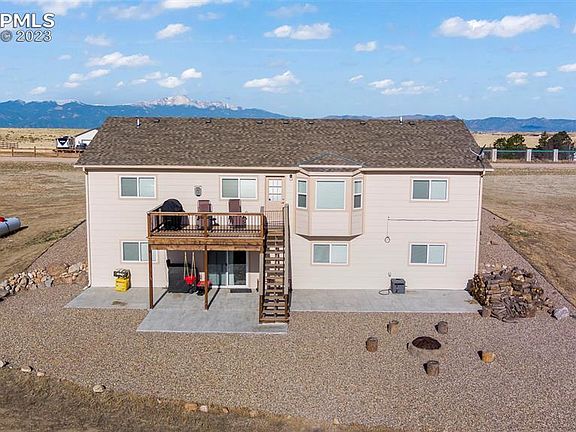 Stunning modern farmhouse-style home nestled on a spacious 5-acre lot in a quiet and peaceful neighborhood. This beautifully designed property offers a beautiful blend of rustic charm and contemporary elegance, with every detail meticulously crafted to create an idyllic country living experience. Greet your guests on the front porch or enjoy the stunning mountain views and watch the sunset. Step inside to find a warm and welcoming interior that features an open floor plan with vaulted ceilings and an abundance of natural light. The main level boasts a spacious living room with a cozy gas fireplace, a chef's dream kitchen with stainless steel appliances, granite countertops, and a large island, a dining area with access to the back patio. Also on the main level, you'll find the master suite, an en-suite bath with a soaking tub and separate shower, and a large walk-in closet. Two additional bedrooms and a full bath complete this level. The large walk-out basement is fully finished and offers additional living space with a family room, a game area, a wet bar, 2 additional bedrooms, a full bath, a third bonus room that could be used as a 6th non-conforming bedroom, laundry, and ample storage space. The 2-car garage provides plenty of room for vehicles and toys. Outside, the property features 5 acres, a deck off the main level and patio from the walk-out, firepit, and plenty of space for outdoor entertainment and activities. This exceptional property offers a rare opportunity to own a stunning home on a private and serene lot, while still being conveniently located just a short drive from Colorado Springs and all its amenities. Don't miss out on this amazing opportunity to make this home yours!