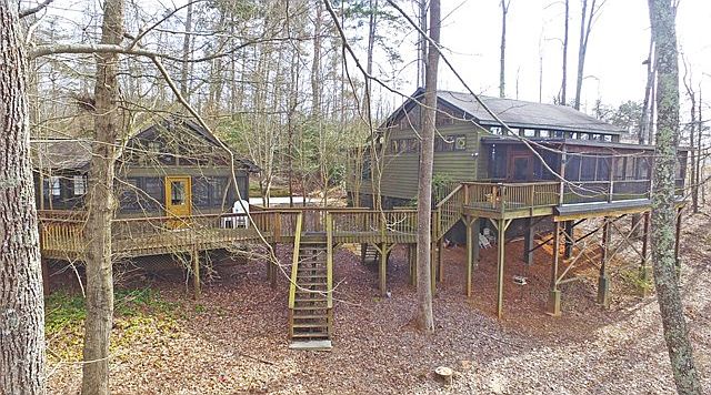 Great deal, 3 buildings for the price of 1 on 1.28 acres! Main lakefront home is custom timber frame w/ huge view of Lake Lanier. Easy walk to single slip party dock on DEEP water, 2BR & 2BA w/ additional lofted sleeping area, open floor plan, rustic architecture. Guest cottage near water s edge has 1 BR, 2 BA, kitchenette, family room. Homes connected w/ fantastic deck overlooking lake. Oversized 2-car garage/workshop has unfinished office space above, stubbed for BA. Fabulous secluded vibe but just 2 mins from I-985 easy commute to Atlanta. Zoned VC so would be GREAT vacation rental (or family compound).