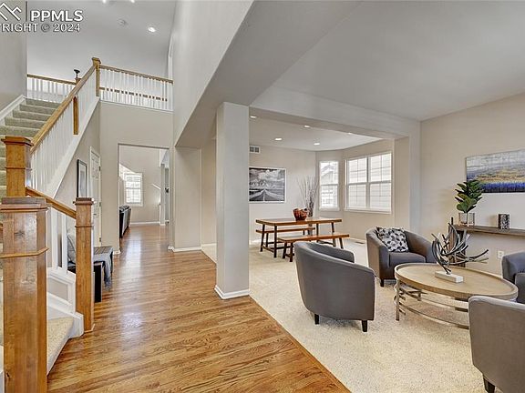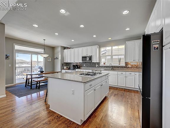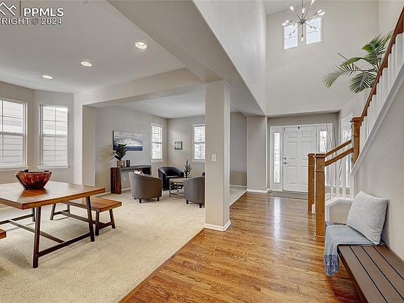 Discover luxury in Castle Rock’s sought-after Meadows subdivision. Perfectly blending elegance and functionality, this property features vaulted ceilings, an open floor plan, and a backyard oasis facing the greenbelt, offering peace and privacy. The welcoming entrance invites you into a world of sophistication with gleaming hardwood floors and a neutral color palette, ready to complement any décor. The heart of the home, a bright and spacious kitchen, is equipped with Silestone counters, a large center island with a breakfast bar and gas cooktop, double ovens, and plentiful storage, making it a chef’s delight. The adjoining eat-in area boasts views of the picturesque surroundings, ensuring every meal is accompanied by nature’s beauty. Upstairs, the master suite is a haven of relaxation with a classic tray ceiling, personal coffee bar, and a luxurious 5-piece bath featuring a large tub and expansive closet. The home’s thoughtful design includes designer plantation shutters, a main floor study, half bath, and an open-concept living area flooded with natural light. Outdoor living is redefined with an expansive covered deck overlooking the greenbelt and The Meadows Trail system, providing a serene backdrop for gatherings or quiet evenings. The finished walk-out basement adds versatile space for entertainment or guest accommodations. This home is not just about aesthetic appeal but also practicality, with a high-impact, low-maintenance tile roof, air conditioning, ceiling fans, and numerous updates for modern living. HOA benefits include access to two community pools, enhancing your lifestyle with leisure and relaxation options. With 4 bedrooms, 3 baths, and a layout designed for both comfort and entertainment, this property is an ideal sanctuary for those seeking a blend of luxury and convenience. Don’t miss the chance to make this Castle Rock gem your own and enjoy a lifestyle where every detail caters to your comfort and enjoyment.