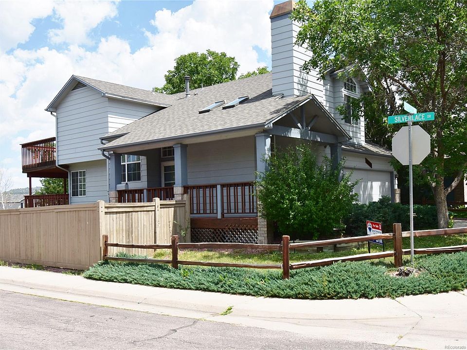 Fantastic opportunity to own in The Meadows for a reasonable price. This 3 bedroom, 2 1/2 bath home sits on a great corner lot with a charming wrap around porch to the front door. The main level offers a great room with vaulted ceilings and wood burning fireplace with mantle, dining area and open kitchen and laundry! Upstairs you will find a loft with a balcony, full bathroom, secondary bedroom, and the Master Suite, complete with his and her walk-in closets. The finished garden level basement has a large bedroom, which can be used as an additional recreation room. New carpet throughout, new flooring in upper baths, new interior paint, newer roof (2017) and newer appliances (2 years old). Fenced backyard, great deck, easy access to all levels of schools, shopping, dining and Castle Rock's vast trail system. Priced right to allow for additional improvements! Hurry this one won't last long!