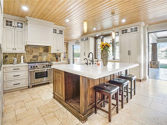 At the heart of the home is the chef’s kitchen, with top-of-the-line, high-performance appliances, including a six-burner Wolf range, Sub-Zero refrigerator, saltwater dishwasher, custom cabinetry, and stone backsplash—all reflecting exceptional attention to detail.
