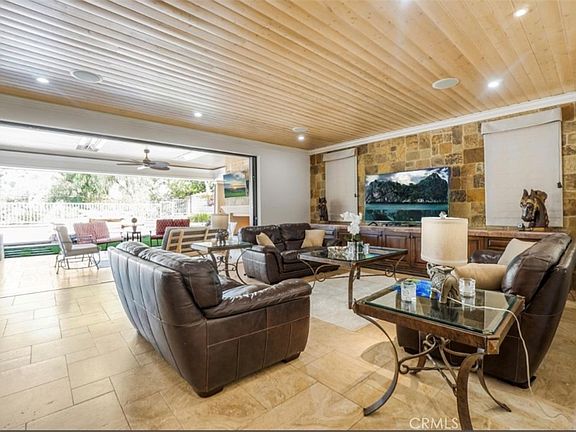 Step into a world of sophistication with LED recessed lighting, premium surround sound in the family room and in the California room with smart control panels for ultimate convenience—lighting adjustments are just a touch away. The California Room, a seamless indoor/outdoor living space, is enhanced by high-end Western glass sliders and new artificial grass, making it ideal for entertaining large groups. Designed by John Shippy, Orange County's premier landscape designer, this resort-style estate features an expansive 850 square feet of additional space. The California Room is equipped with ceiling heaters, cove lighting, ceiling fans, built-in speakers, a custom 48" Lynx BBQ grill, and a stunning stone gas fireplace, creating a smooth transition between the indoors and outdoors.