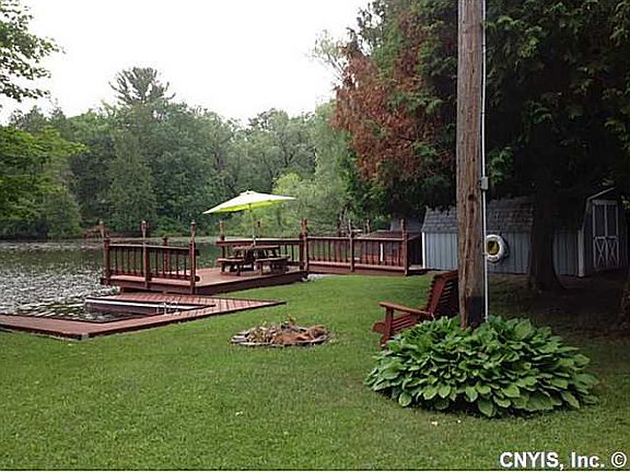 A summer paradise of swimming, fishing, and boating right outside your door! This fully furnished waterfront cottage sleeps 9 comfortably with heat for winter use. The sale includes a 12' Dura fishing boat (with trailer, 4.5hp Mercury motor, battery operated trolling motor, fish finder, 2 swivel seats, anchors, life jackets, oars), 14' We-No-Nah fiberglass canoe with paddles, 4 person paddleboat with canopy, and a shed full of water-fun accessories. Beautiful decks at the waters edge have a 6 person hot tub, 8'-4"x14'-8" (int dim) boat slip, and dining area. O-M Coop electric. Sold as is.