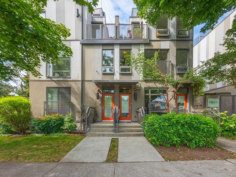 Discover urban living at its finest in this contemporary 3-level townhouse at SoMa Living in vibrant Mount Pleasant. This unique 1 bedroom, 1 bathroom home offers over 756 sq.ft. of efficient interior space plus a private rooftop deck with sweeping city views. The open-plan main level is highlighted by sleek modern finishes, expansive windows, and abundant natural light. Perfect for young professionals or couples, this home combines stylish design with everyday convenience. Steps to Main Street cafés, restaurants, and shops, and minutes to Kingsgate Mall for daily needs. Includes 1 parking and 1 storage locker. School catchments: Florence Nightingale Elementary and Sir Charles Tupper Secondary. OpenHouse Oct 4 Sat 2-4PM