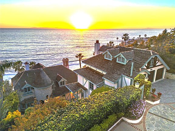 A rare coastal opportunity. This grand oceanfront Estate is a truly one of a kind compound offering panoramic views of the shoreline and Pacific. Spanning over half an acre, this enchanting property features direct beach access, lush grounds and a resort style pool and spa. This iconic property consists of a primary residence expanded and redesigned in 1985, pool side guest quarters and a contemporary guest unit built in 1994. Stone garden pathways or a convenient funicular lead to the main residence. The Sea Castle is a masterpiece of craftsmanship highlighted by a stone turret, diamond patterned windows, and a distinctive shingled roof inspired by ocean waves. Inside, stone floors, an elegant floating staircase, and soaring beamed ceilings create a timeless ambiance. Natural lighting and picturesque ocean views immerse the living spaces. The grand living room exudes warmth with open beamed ceilings, a curved brick fireplace, clerestory windows and French doors opening to a spacious terrace. A formal dining room with handcrafted custom built-in provides an intimate setting for large gatherings, while the kitchen showcases inlaid wood cabinetry, a vintage Range, a dining nook and butlers alcove. The private primary suite offers an ocean view deck, fireplace, wet-bar, dual bathrooms and a walk in closet. Additional highlights include a large loft style office with built ins and ocean views, an inviting oversized family room with ocean views and 2 thoughtfully designed main level guest rooms. A private pool side guest quarters offers a living area with ocean views, a fireplace and sleeping area with ensuite bath. A separate second residence provides a contemporary coastal design with high ceilings, abundant natural light, 3 bedrooms (two ensuite), a den and ocean view patios. Outdoor spaces elevate the oceanfront lifestyle with multiple terraces, black-bottom pool and spa, and a pathway leading to the sandy paradise of Thousand Steps Beach where you can launch your sea kayak or paddleboard. The carriage house styled oversized three car garage features ample storage and an enviable motor court for additional off-street parking. Perfectly suited for multi-generational living, hosting guests, special events, or your very own private retreat. A rare offering that captures the essence of the most coveted oceanfront living in Laguna Beach. A property of this caliber is seldom available. Experience the luxury, legacy and lifestyle of this one of a kind opportunity.