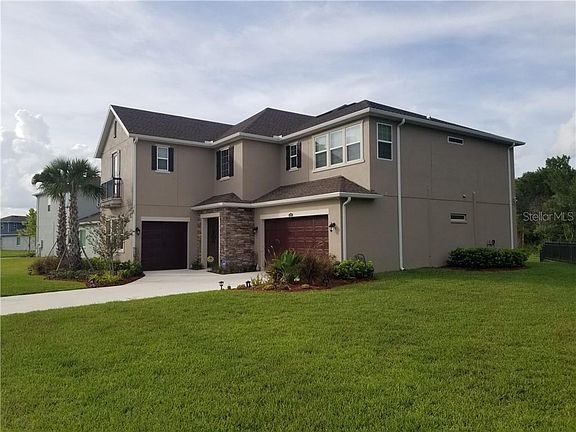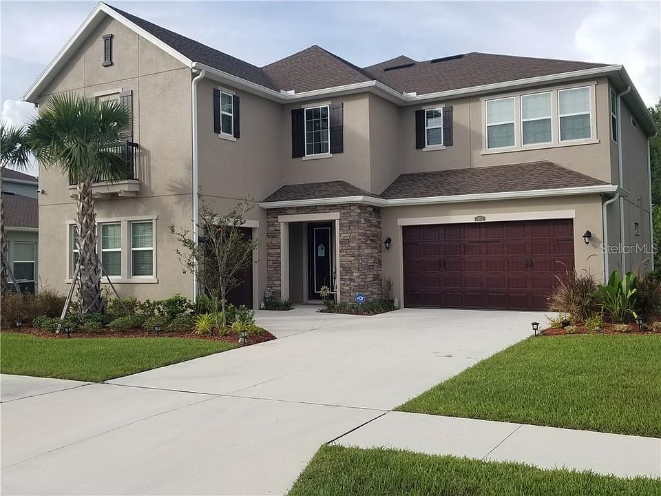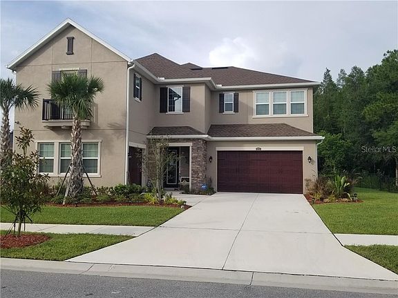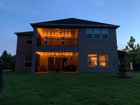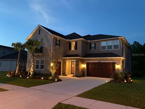 THIS BEAUTIFUL NOT EVEN 2-YEAR-OLD HOME FEATURES 5BDR/4FULL BATHS, BONUS ROOM AND OFFICE! The grand foyer features twenty-foot ceilings providing an elegant entry with tiles throughout the first floor living space. The great room overlooks a large, covered/screened lanai overlooking conservation with connectivity to the upgraded gourmet kitchen allowing for ample room for entertaining. The kitchen features an abundance of cabinets with large walk-in pantry, an oversized single-level island and large eat-in kitchen space, and includes upgraded stainless steel double built-in ovens, microwave, dishwasher, and refrigerator. This home also has an exterior large 125-gallon propane tank for a 5-burner stainless steel cooktop and will allow for piggybacking a second tank for future outdoor kitchen and/or generator. This home is fully tech ready - It has dual-zone full speaker system throughout the great room/kitchen & lanai downstairs, and in Bonus room & Balcony upstairs as well as cable and LAN connectivity in every room of the house, including a LAN drop in the ceilings on both floor for easy PoE Access Point setup to ensure there are no dead Wi-Fi Zones throughout the house. The gorgeous upgraded wood and medal spindle stairs leads up to 4 bedrooms and bonus room upstairs. The Large master bedroom with private screened-in balcony has a beautifully designed master bath with dual head shower with seat, garden tub and his & her separate sink and counter space. 3 additional cabinets come with the house (not installed) to further upgrade the master bath. The oversized master bedroom closet allows for plenty of room to keep his and her closet organized. Convenient upstairs laundry room has upper cabinets, a sink, and a custom design hamper/lower storage cabinet. This home has a 2-car garage with another 1-car garage with separate entry, both with ceiling storage racks mounted to keep the garage clutter free. The home office is perfect for working from home and away from the main living area for quiet & privacy. All rooms, balcony and lanai have upgraded fan/lights with remotes and the house is equipped with a whole house water filtration system & water softener system for drinking water from the faucet. 2 AC Units help keep each floor to the desired temperature. This gated family community has access to a resort Style Community Pool/Clubhouse as well as access to top rated schools, hospitals, restaurants, shopping, and all major highway access. This home has lots of extras so schedule your viewing ASAP DO NOT WANT TO MISS.