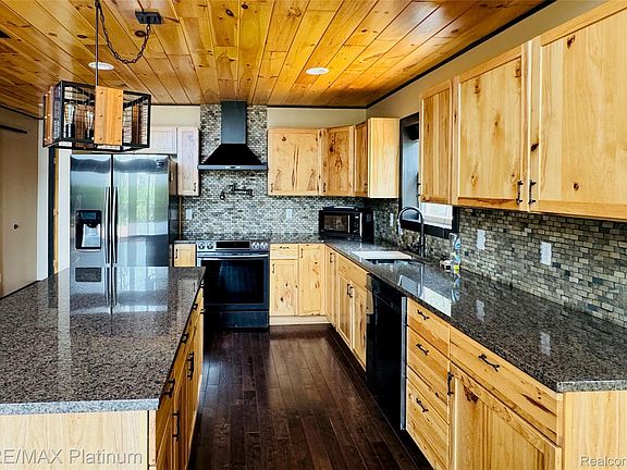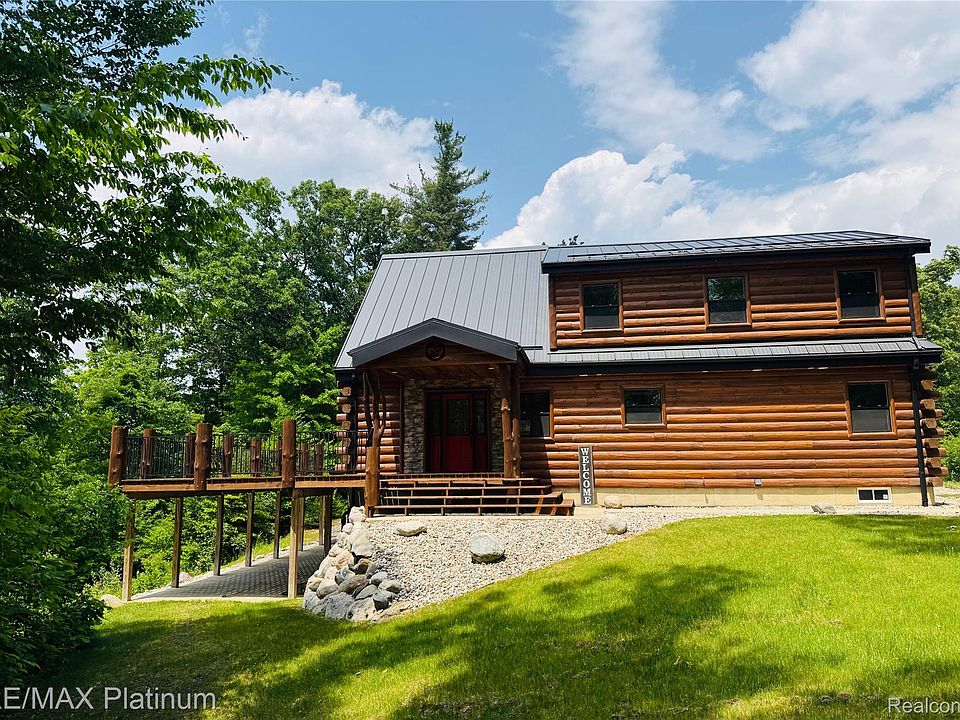 Don’t miss this rare opportunity to own a custom-built log home on 10.8 wooded acres, privately situated at the end of a quiet cul-de-sac. This exceptional property backs directly to the Thornapple River and the Paul Henry Trail, offering unmatched privacy, natural beauty, and recreational access. Crafted with care and quality, the home features soaring cathedral ceilings, tongue-and-groove walls, and an open-concept layout. The custom kitchen boasts hickory cabinetry and granite countertops, opening to a warm and inviting living area with fireplace and expansive views of the property. Enjoy your morning coffee or evening sunsets from the large deck overlooking abundant wildlife. Key features include: SIP panel construction for superior insulation and energy efficiency, New metal roof (2023), Main floor primary suite and laundry, Insulated attached garage, partially finished walkout basement ready for finishing, outdoor wood stove, storage shed, and elevated deer blind for watching nature.