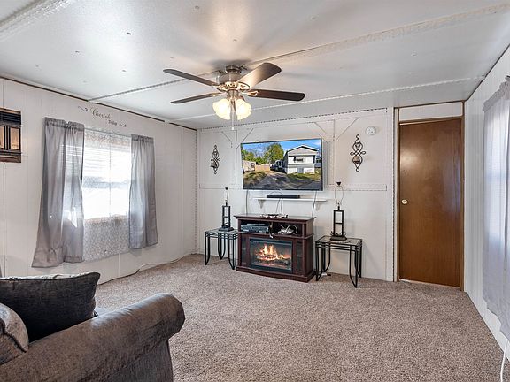 Breezy Acres 2 bedroom, 1 bath home with great outdoor space. This home has a front patio, shed for storage (including snow blower and push mower), partially fenced in yard, and front enclosed sitting porch for those warm summer evenings. Inside, the open living room and kitchen welcome you. The living room comes with the items you see pictured (TV, couch, electric fireplace, end tables) so you can conveniently move right in. To the right of the living room is the front bedroom. The windows have all been replaced with double pane insulated vinyl and have exterior window awnings to keep the elements away. The kitchen is open with an island and breakfast bar. Kitchen appliances include: microwave, refrigerator, propane stove, toaster, garbage disposal and coffer maker! Off of the kitchen is a laundry room with access outside. The hot air furnace has a brand-new kerosene tank installed 2023. There is full bathroom off of the laundry room and the back bedroom comes fully furnished. The exterior has been well maintained with vinyl/wood siding, shingle roof 2012, and vinyl skirting. HOA does allow 2 dogs/2 cats. No rentals allowed. Park approval required.