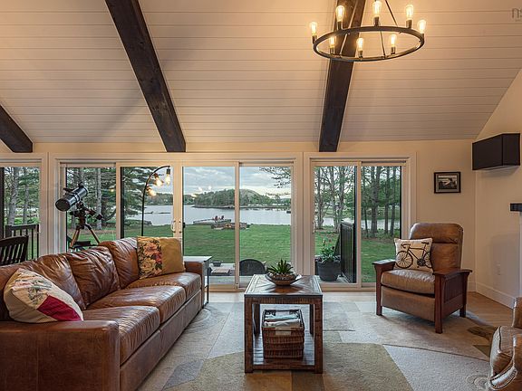 Tucked along the banks of the LaHave River, 32 Airlee Acres invites you to experience the magic of Nova Scotia's South Shore from the comfort of a modern, thoughtfully redesigned retreat. Nestled in the peaceful community of Pleasantville - just 10 minutes from the shops and services of Bridgewater and an hour from Halifax-this beautifully reimagined 4+1 bedroom, 2.5-bath home offers a lifestyle as serene as the LaHave River itself. Set on a level, landscaped lot with 123 feet of direct frontage on protected Sperry Cove, you'll enjoy deep water mooring with easy access to the open ocean-perfect for sunrise sails, peaceful morning paddles, or simply soaking in the tranquil water views from your private wharf and man-made beach. Best of all, you can keep your boat dockside all season. Step inside to discover vaulted ceilings, an open-tread staircase, and a wall of windows framing the stunning views. The open-concept main level is filled with natural light, offering a seamless flow between living, dining, and kitchen spaces. The kitchen is made for slow Sunday brunches and lively evening dinners, featuring stainless steel appliances, generous prep space, and easy access to expansive waterside decks. Tucked away in its own wing, the primary suite feels like a sanctuary-with its own staircase, spa-inspired ensuite, walk-in closet, and Juliette balcony that opens to the fresh river breeze. Three additional bedrooms and a full bath in a separate wing provide added flexibility for families. The finished lower level offers a large family room and a bonus flex space ideal for a guest room, a home office or gym. Recent upgrades include the wharf, crib and docks (2023), custom fire pit and patio, 18 kW Generac whole home generator, and 30 Amp serviced RV pad. With mature trees, fibre internet, and a quiet setting just minutes from amenities, this is a rare chance to live life at the water's edge, where every day feels like a getaway.