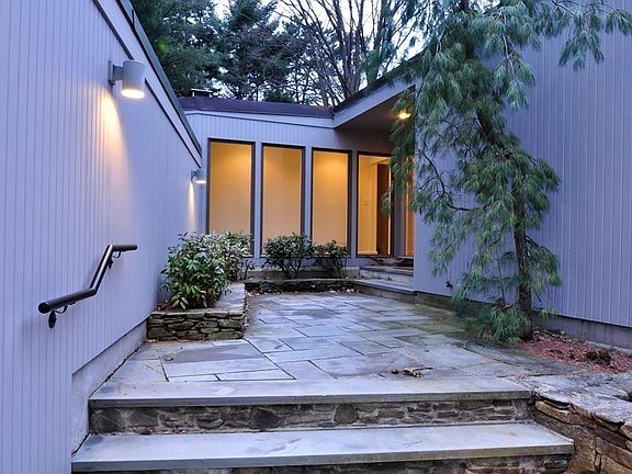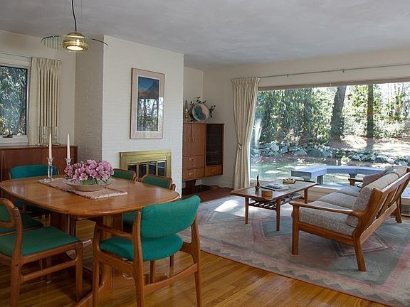 This extremely well-maintained Modernist classic luxuriates in a professionally landscaped half-acre lush lot in the highly sought-after, historically significant Five Fields, a pioneering neighborhood designed and developed by The Architects Collaborative (TAC) in the 1950s. Walls of insulated glass welcomes the outdoor views and bathes the house with natural light. There are three bedrooms on the main level, including a master suite with walk-in closet and a full en suite bath with jacuzzi and shower. Hardwood floors under 1st flr carpet. Open concept floor plan with living, dining, and family rooms all flowing naturally. A large and bright eat-in kitchen also opens to a second deck and the first floor laundry is located in the hallway leading to the bedroom wing. A heated driveway melts away snow and ice and leads to an attached two-car garage. The pride of five-plus decades of ownership is obvious throughout this special home, a unique and rare offering of a turn-key contemporary.
