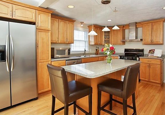 A beautifully maintained Cape, on a street with a cul-de-sac, offers an updated kitchen addition, 2 fireplaces and gleaming hardwood floors on the 1st and 2nd level. The kitchen features a sunny breakfast area, stainless steel appliances, a large island with overhang for seating, maple cabinets, skylight, and a slider to the deck. Spacious second level bedrooms with plenty of storage plus full shed dormer. A finished lower level features a family room with a stunning stone fireplace and a private office. This charming home, in the Harrington School district, is near conservation land, public transportation, easy access to shopping and highway.