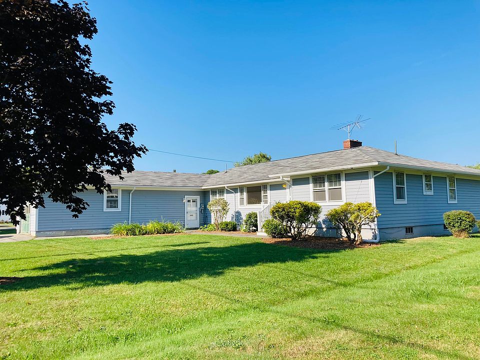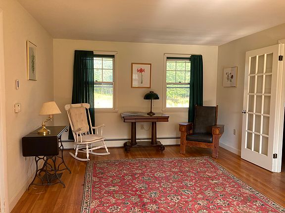 A charming, ranch on 1.95 acres looking onto a beautiful open field beyond the back yard. Oak hardwood floors throughout, living room with dining at one end, den with gas fireplace off living room, kitchen with breakfast room, large family room/studio with built-in shelving, two bedrooms and a laundry-dressing room with double closets off back bedroom. One full bath and one half, all for easy, one-floor living. One car, attached oversized garage with entry/mudroom for coats and boots..