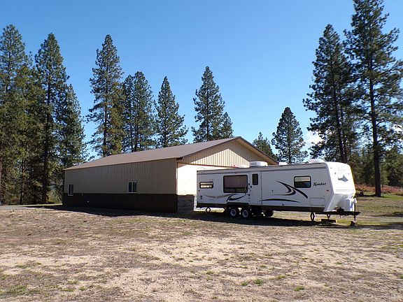 Amazing opportunity with this 2400 sq ft shop-home on 4.94 level acres near Kettle Falls. The Shop allows for Airplane or RV storage, it is 35x40. The adjoined living section of the home is 25x40, 10' ceilings, kitchen, living-room, bedroom, bath and laundry. It is not completely finished but livable. Pellet stove and floor heat in the home and a portion of the shop. The floor is 4'' thick, 2' squares w/rebar. The building has exceptional electrical upgrades and plumbed for a 2nd bath and includes 3-bed septic and all RV facilities. The property sits above Lake Roosevelt w/peek-a-boo Lake view, Deeded Airport use w/a grass base and private only to the adjacent parcels. (It does not receive much use.) 1200 volt power, underground transformers, 6 GPM shared well. Short Platted and Surveyed Possible owner contract.