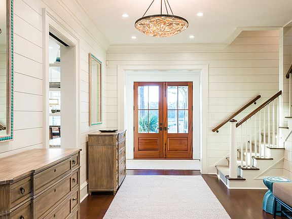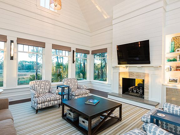 Step inside the windowed front doors, crafted of gorgeous mahogany, into a spacious entry with white shiplap walls. Dark, wide-plank hardwood floors stretch throughout the sun-filled home and guesthouse, and beautiful, hurricane-rated windows are everywhere. The family room features two walls of windows framing the tranquil marsh, white shiplap walls, vaulted ceiling, and a lovely fireplace with stone surround.