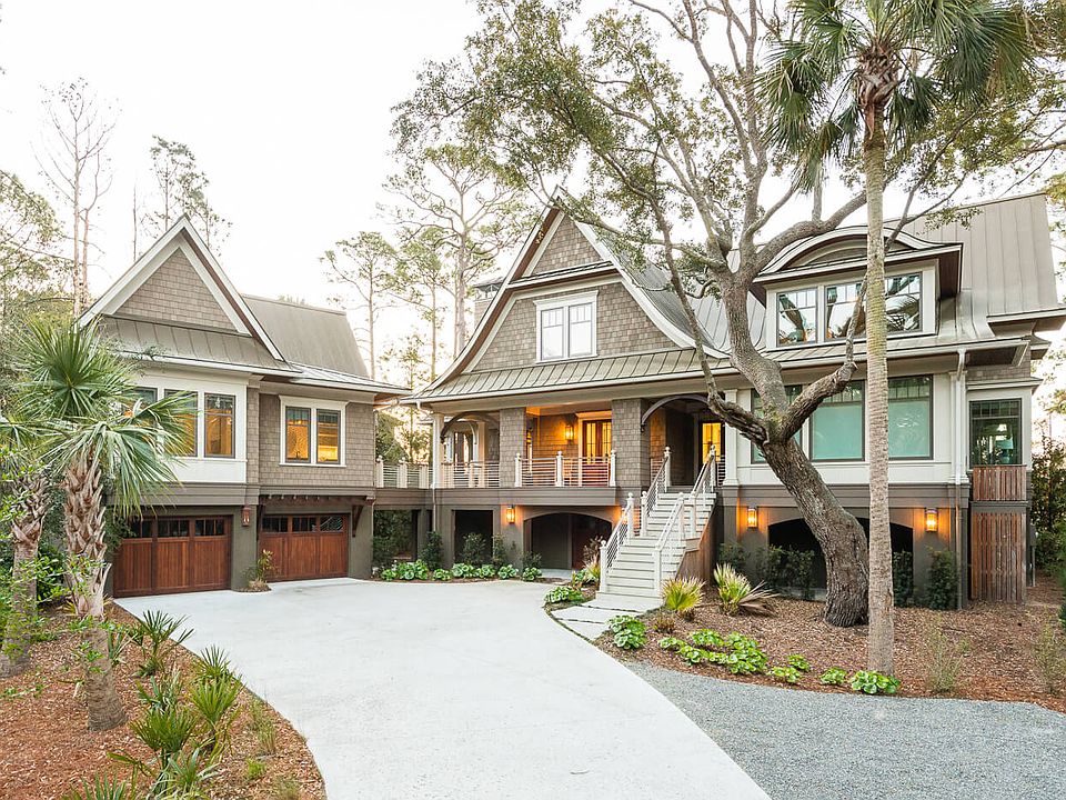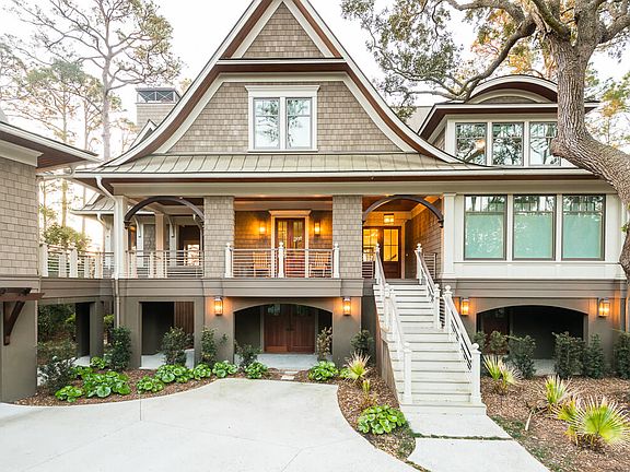 Newly constructed in 2017 in coastal Lowcountry style with a metal roof, a shimmering pool nestled into a wide, curving deck overlooking the marsh, and a guesthouse connected by an outdoor, upper-level walkway, this exquisite home is located in The Preserve, a highly desirable neighborhood with a community dock.
