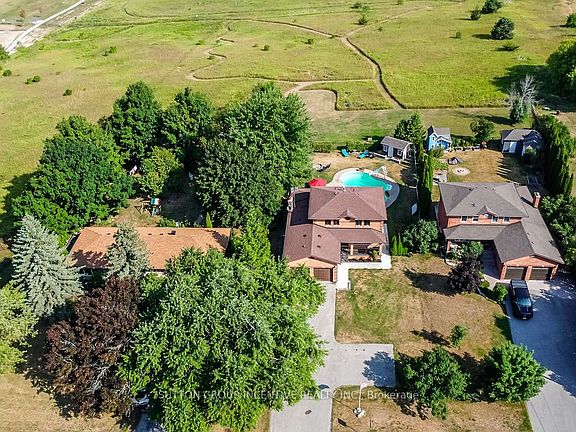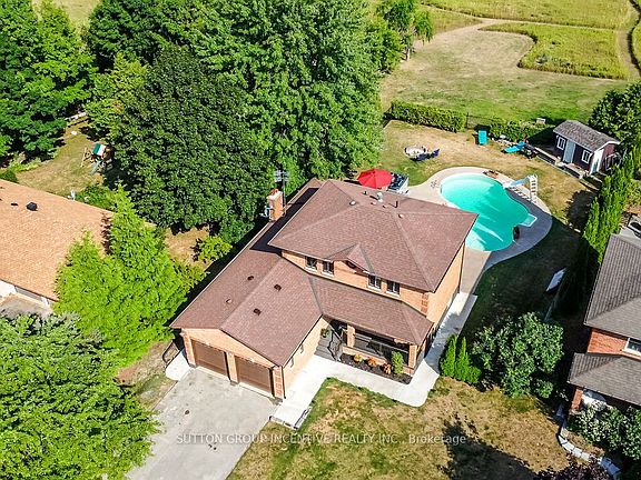 One of the most beautiful private backyard views. Walk out the back and in minutes explore a tree fort, library which is fantastic for families (splash pad, pickleball, hockey rink, exercise trails, dog walk, year round social events as well as the curling club. Outdoor living space allows for lazy pool days (heated inground), great bbqs on O/S Deck-parties and sitting around the camp fire at night. Hot Tub. Gas BBQ hookup. This home is the ultimate entertainers house or for families needing 5-6 bedrooms. Close Proximity to 400 makes commuting to the GTA or cottage country super easy. Main Floor Living Room, Family Room with Wood Burning Fireplace & Dining Area. Office was built for stock trading, reinforced wall allows for easy installation of multiple monitors (counted as a 3rd- main floor bedroom). Bonus sun room makes an excellent buffet/bar station when entertaining. Chefs kitchen equipped with Viking 6 burner gas range with commercial stainless hood, Viking warming oven which makes entertaining a breeze (never serve luke warm food again), pot filler and lots of counter space, plus the view when washing dishes is fantastic. Master has luxurious top of line walk in shower with rain shower nozzle, 6 additional shower jets plus shower wand for the ultimate immersive experience, (2) large walk in closets, gas fireplace & balcony off bedroom is a great spot to enjoy the views while having your morning coffee. 2nd Bdrm & 4pc on upper floor. Tons of storage, big deep closets, basement tool room can be easily converted to wine cellar, entire vault room for prized possessions, safe room?. 3 Bdrms & 4pc in Basement (newly finishing flooring & Paint). Large Coldroom. Lots of outlets everywhere (even in closets). Garage with high doors use as a shop or garage (gas heater) with tons of storage and work space. Big long driveway makes parking campers, RV's and trailers a breeze. New front concrete walkway and to side yards. Quick closing available.