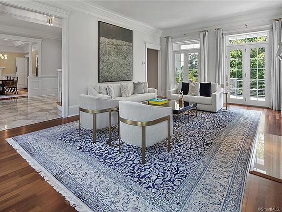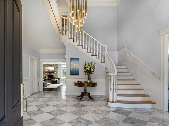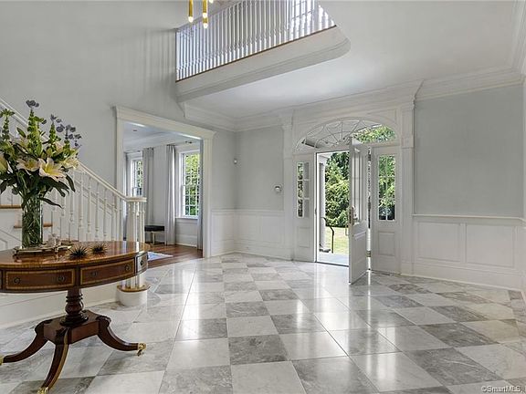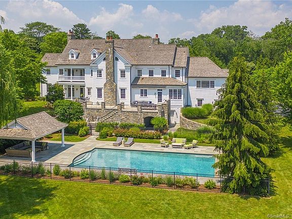 Discover a stunning country estate in the heart of Greens Farms in a beautiful neighborhood perfect for jogging, biking to the beach and walking to the train. Sprawling sylvan views fill the home with serene natural vistas throughout the day and an open southern exposure bathes the home in glorious natural light. Beautifully flowing interiors with high ceilings throughout include a sun-drenched living room and handsome study with a fireplace that forms an ideal home office. The chefs kitchen is home to a cheerful breakfast area and doors to the terrace for seamless indoor/outdoor entertaining. Barbecue with neighbors and friends on the kitchen terrace or relax in the shade of the pergola looking out across the pool on two beautifully landscaped acres enjoying unmatched privacy. The property is also equipped with a Tesla charger and generator. Upstairs, the exquisite primary suite is home to a romantic covered balcony and pair of spa baths. Three family bedrooms with en-suite bathrooms complete the second level. Between the first and second level, a spacious playroom is poised beneath a vaulted ceiling along with an additional bedroom suite. A third level bonus room and additional bedroom and bath form flexible living spaces and au pair suite. The finished lower level offers something for everyone with a home gym, billiard room, media room, wine cellar and private tasting room. Cheers!