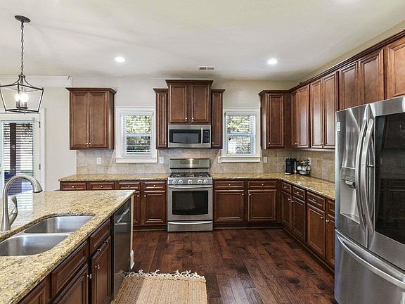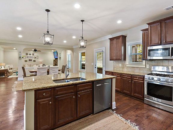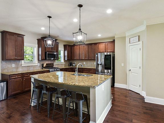 • RoomKitchenFeatures: Granite Counters, Kitchen Island, Pantry, Recessed Lighting, Floors-Hardwood, Cabinets-Stained, Backsplash-Tiled