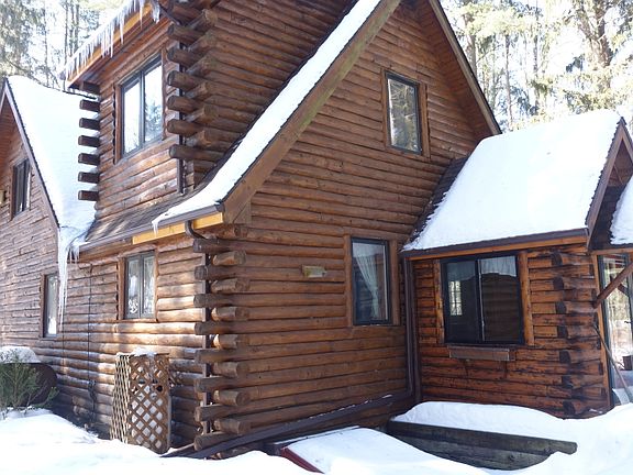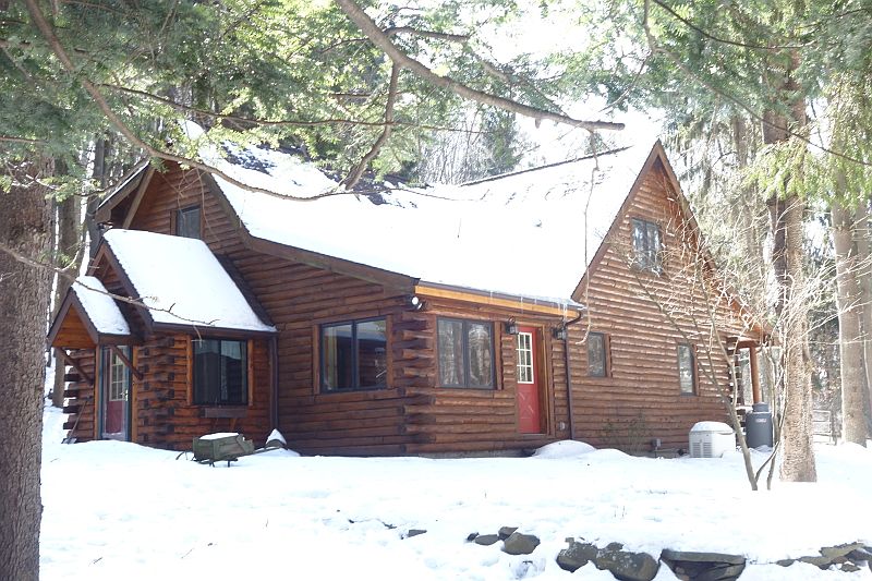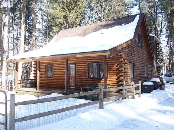 Country Living! Charming 3 BR LOG HOME nestled in the Woods of Knowlton,14 acres with Babbling Trout Brook, 4 Bay Barn/Garage Pole Barn, Step inside to the Warm Appeal of natural wood in every room!