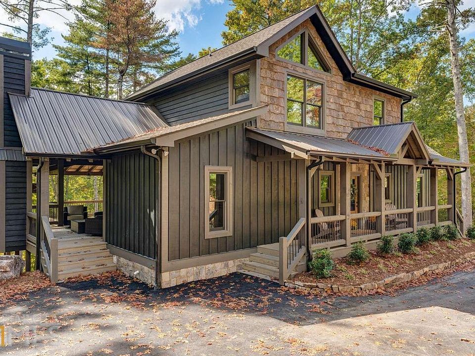 Modern rustic with a tree-house feel....This Kevin Teague Custom Home sits nestled in the woods between Blue Ridge and Elijay. The home boasts 4 large bedrooms, 4 full baths, 2 half baths, and 1800 sqft of outdoor decking, and so much character throughout. Step inside to be greeted by the modern touches mixed with rustic flair, custom cabinetry and lighting, acacia wood floors, charming furnishings and decor, natural wood and light, and an open main-floor plan large enough for the entire family. Continue on to the master on the main and you'll find a large tile shower, and a 10x10 master closet, and access to the large covered deck & outdoor fireplace area. Upstairs you'll find two bedrooms and another large bathroom. On the terrace level, you'll find a kitchenette, living area with a stacked stone fireplace, another full master suite AND an additional laundry room-perfect setup for a MIL suite! The grounds are completely maintenance free and have been tastefully landscaped. The natural lighting that flows into the house and the peace & quiet this location offers give this home the most inviting "treehouse" feel. Feels like home to me....