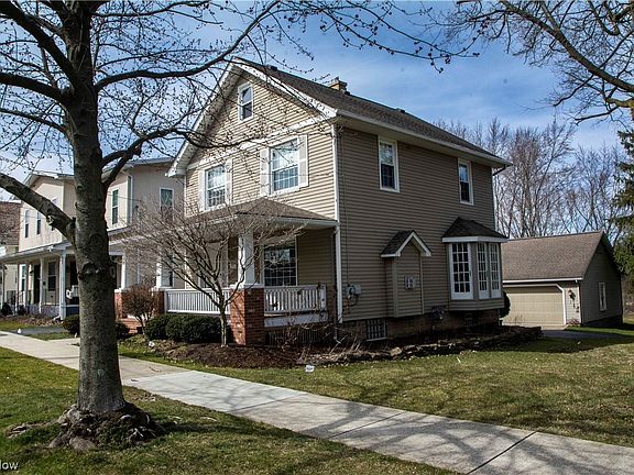 Welcome to this adorable 2 story home in the heart of Canfield. Three bedrooms, 1.5 baths, walking distance to "The Green". This home features a lovely living room with a beautiful gas fireplace, plus redone hardwood floors. This leads right into the dining room with bay window and hardwood floors. The kitchen is adjacent, with a 1/2 bath off of it. The foyer is very typical of a home this age, plenty of fabulous woodwork and ceramic flooring. There is an enclosed back porch room with cupboards, and plenty of storage. Upstairs are 3 bedrooms and a large spa-like full bath, including a tiled shower, separate tub and double sink vanity. Oversized garage is detached and sits behind the home. Backyard includes a freshly painted deck, invisible fence goes behind the garage for plenty of space for furry friends. Driveway has a turn around in front of the garage. The front of the home includes a large covered porch with brick steps. Close to everything! New furnace and a/c. See supplements fo