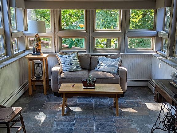 Huge price reduction! Live among nature on a quiet road in desirable Warwick, NY. Sun-filled home includes Anderson windows throughout. Tiled mudroom opens to living room with vaulted ceiling and Harman pellet stove. Freshly painted kitchen/dining area has custom oak cabinets and new light fixtures. Patio door opens onto huge, partially enclosed deck. Newly tiled, all season sun room. Custom bar with built-ins. Freshly painted full bath. Spacious bedroom/office. Upstairs, the large master bedroom has walk-in closet and sliding glass door that leads to private deck. Attached laundry. Extra bedroom boasts views of backyard and pond. Full bath has large picture window and skylights with Jacuzzi tub and new shower. Walk-out basement includes two oil tanks and freezer, with plenty of space for workshop and finishing for even more living space. Backyard offers direct access to pond. Kayak and fish right off of your private dock. Plenty of woods to hike around and trees to tap for syrup. Metal roof and wood siding provide minimal maintenance. Property includes shed and custom built planters. Private drive with ample parking finish off this peaceful spot that is walking distance to apple orchard and minutes to downtown Warwick and hospital. Low taxes. Award-winning Warwick school district. Power tools and most furnishings negotiable.