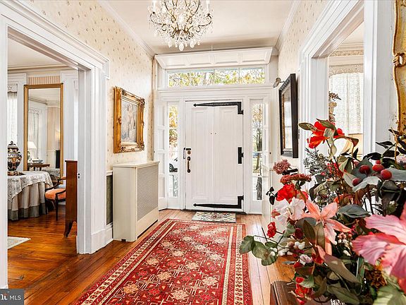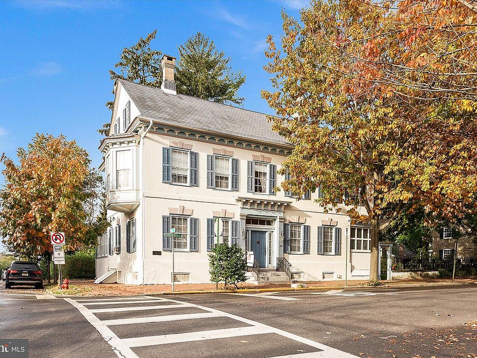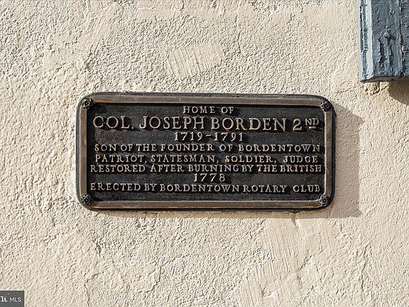 Own a piece of History, Colonel Joseph Borden settled here at this site. This stately colonial has dramatic high ceilings and hardwood floors. Inside the front door you will find the lovingly kept home. As you enter the large foyer with a beautiful chandelier., you will see the foyer is flanked by two formal rooms. The living room has a marble fireplace with a gas insert and entrance onto the cozy sun porch, just perfect for sitting out on a brisk fall evening and watching Bordentown's people walk by. The dining room features gorgeous crown plaster moldings and a decorative fireplace. This room is large enough for your biggest table with room left over for a sitting area or two. Need a place for your grand piano? There's room for that too. The pumpkin pine floors on this main level have the square head nails, showing the amazing detail of this home. The kitchen is perfect size for cooking and is conveniently located off the grand dining room. The laundry room and butler's pantry round out this floor. There is also a rear staircase that takes you the former maid's quarters complete with a bedroom and a bathroom. This area also features an old closet with original handblown windows that now serves as a linen closet. Coming up the grand staircase from the foyer, you will find four generous size bedrooms all with hardwood flooring. The main bedroom features an en suite bath and connects to another bedroom or you may choose to use it as a dressing room complete with a walk in closet. The two other bedrooms are very spacious. You will also notice the dramatically high ceilings on the second floor as well. There is a staircase that leads to the third floor. It is an unfinished space but could be finished to your needs as another place to "hang out" or office area. Plenty of room to roam in this gorgeous home. Outside you will be entranced by the .43 acre lot that has many gorgeous annuals and perennials, plus a pond. The front of the house has a gorgeous iron fencing that draw photographers to take pictures of it's details. There is an old "smoke house" on the property as well that serves as extra storage area. Many major items have been replaced in this home, the roof is approximately 7 years old and the furnace only 3 years old. This is a "Wow" home and you won't be disappointed by all it has to offer. Short walk to Bordentown Beach where you can enjoy kyacking, fishing and more water sports.