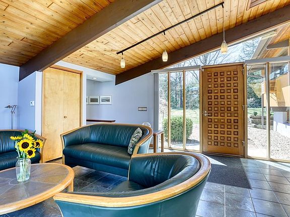A Frank Lloyd Wright inspired custom Deck Home built by Barry Roberts with A MILLION DOLLAR VIEW! Set back off the road on park-like grounds. This is a show-stopping home that is impeccably maintained. This spectacular home allows you to appreciate natures beauty on the almost 3 acres of land. Enjoy the unique & intimate views it shares with both nature & the wildlife that visit this property. An open floor plan designed with distinction surrounded by walls of glass & soaring ceilings. Dressed in only the finest woods, impressing even the harshest of critics with red cedar ceilings, douglas fir beams, red oak floors, birch doors & Mahogany made cabinets, trim work & baseboards. Rich in detail from the floating stairs to the floating fireplace hearth. Enjoy cocktails & watch the sunset from just about every room in the home or outside on the 40ft. deck. Designed with efficiency & includes a 30-panel OWNED solar array. This home will exceed your expectations! AN ABSOLUTE MUST SEE!