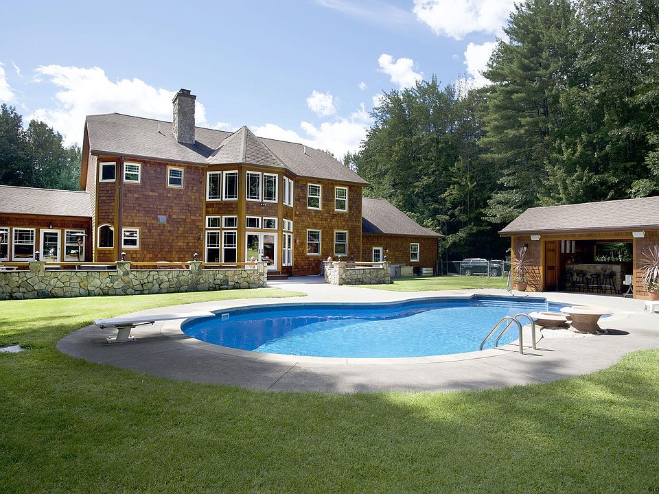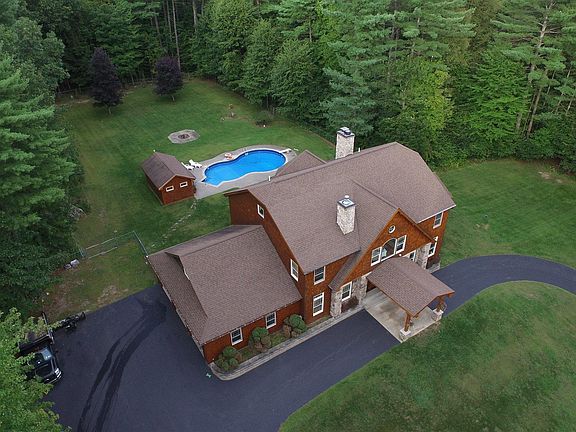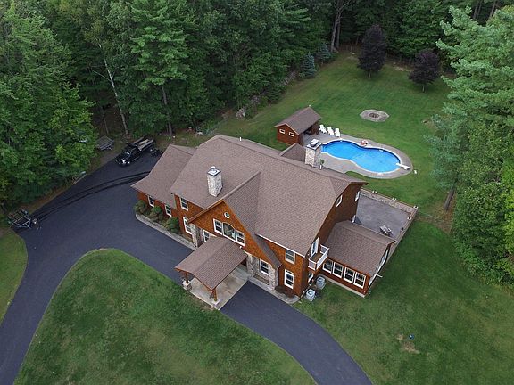 This 4-BR/4BA custom home provides over 5,700 sq ft. of livable space and private outdoor living on 14.02 acres. A formal living room with see-through gas fireplace opens to a patio conducive to entertaining and easy enjoyment of the swimming pool, fire pit and outdoor pool bar. Completing the main level: A gourmet kitchen with Wolf range, center island and pantry. The laundry space, office, dining area, sun room w. pellet stove, first floor bedroom, full bath and access to the 3-car garage. The second floor offers two bedrooms, a sitting room and full bathroom. Adjacent is the master bedroom, features a walk-in closet and gorgeous ensuite. The lower level includes a family room, home theatre, fitness room, full bar and steam shower. Superior craftsmanship attention to every detail.