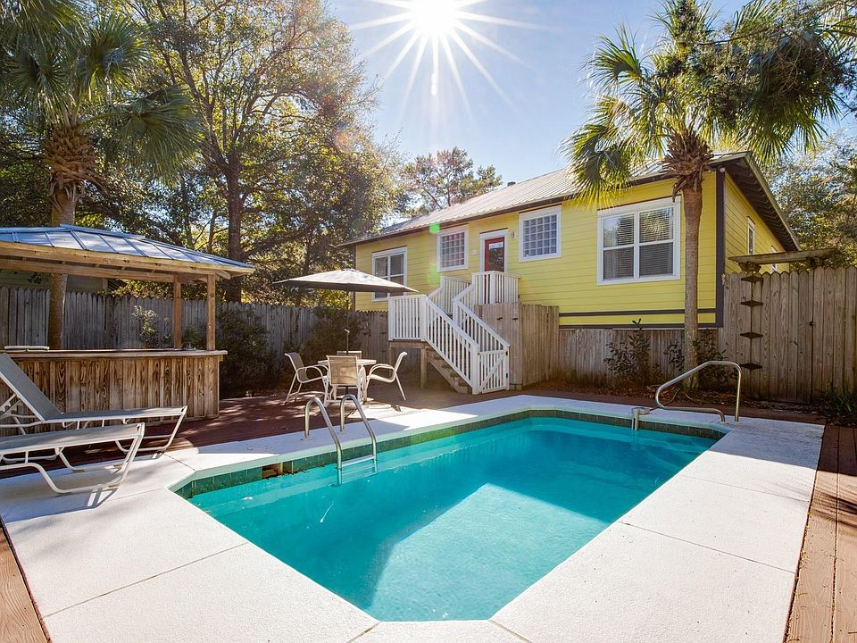 Quintessential Old Seagrove charm! This light + bright beach cottage with a private pool is nestled in the coveted Old Seagrove neighborhood just steps from the beach, dining, activities and the Seaside community. The open concept living and dining area features a fireplace, vaulted ceilings and hardwood floors. An all-white kitchen offers a breakfast bar with seating for four, a tiled back splash and built-in wine storage. Find multiple ways to enjoy outdoor living with a wraparound covered porch and a private, low maintenance backyard with pool, tiki bar and deck/lounge space. Three comfortable bedrooms and two bathrooms complete this adorable beach retreat.