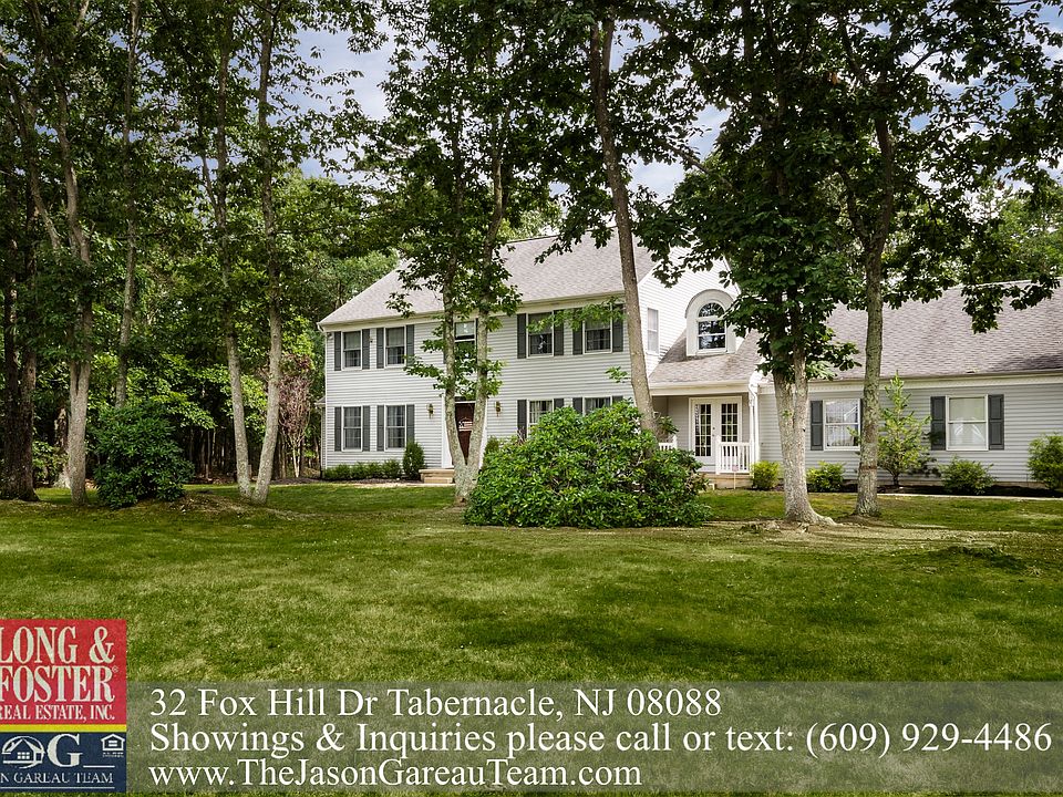 Absolutely Beautiful 4 Bedroom and 2.5 Bath colonial style home in the Eagles Mere section of Tabernacle. This home boasts gleaming hardwood floors throughout, a large open foyer leading you into the living room, dining room, and family room, a large formal living room with French doors and a door way to a sunroom/playroom, an open floor plan, a large family room with a brick fireplace and a 9 foot French door leading to the back deck, neutral decor throughout, a huge kitchen with a breakfast room, a large bay window, and center island, a 1st floor Office with French doors to a secondary front porch, a large dining room off the kitchen that is also open to the foyer, large bedroom sizes throughout, a full finished basement, and top it off with a huge master suite with a large master bath and walk-in closets. The exterior of this home offers professional landscaping, a large two-tier deck that runs almost the entire length of the house, a 2-car attached garage, a shed, a huge beautiful backyard w/ plush grass, and all of this on a huge 2.79 acre lot. Don't miss your opportunity to see this wonderful home.