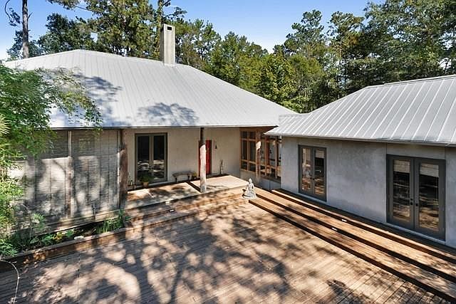 Feng shui. This property was made for entertaining. Main House is 2 bdrms & 2.5 baths w/wide open living spaces, sleeping porch & decks. Kitchen is a gourmet chefs dream w/an extra large island of granite, custom handmade cypress cabinets overlooking living & dining rms & double fireplace. All connected to 2 bdrm/2 ba guest home. See attached list of amenities. Sculpture garden, stocked pond, wooded trails, gym, sheds.