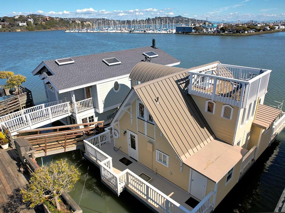 Located second from the end of the dock with wide open sweeping views of the bay from all directions! Kitchen recently remodeled with new appliances and cabinets.The sky-deck has panoramic views of the bay, Belvedere and Mt. Tam. The open floor-plan allows for views and sunlight from almost every room. Large concrete hull for storage and plans included to add another bedroom. An outdoor storage closet for tools and sports equipment. The floors are gorgeous hardwood planks. Extremely large sprawling boat dock and decks on both sides. This one has it all and it is priced so well to sell right away.