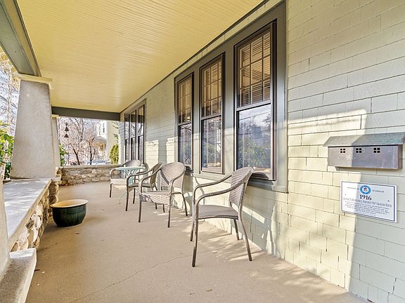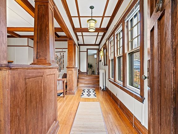 This home is an Arts and Crafts gem. Meticulously maintained, the property is filled with amazing oak built-ins and hardwood floors. Built in the American Bungalow style it features a large fieldstone front porch. The entry hall beyond the oak and beveled glass front door, welcomes you into the living room filled with natural light, a working brick fireplace and built in cabinets. Pass through bifold French doors and into a dining room with a generous built-in sideboard and box beams. In the kitchen, custom cabinetry evokes the Arts and Crafts style. A home office, a full bath and the third bedroom also located on this floor. Head upstairs to find two very generous sized bedrooms, one with multiple closets, and the second bath. There is access to attic storage in the pass through room here as well. A one car detached garage, an additional storage building, a large flat yard and a wooded grove all work together to complete this truly beautiful property.