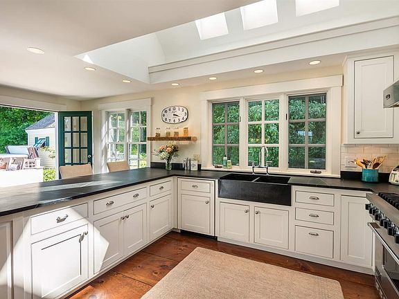 SNOWS HILL- The perfect reproduction Colonial in convenient Hartland location. You will feel inspired coming down the drive and through the gate to this wonderful property. The courtyard is welcoming and the attention to detail is persistent. There is a fantastic balance of indoor and outdoor living- the updated chef's kitchen is amazing and bright, opening onto a large deck perched up to take in the long range views and incredible pond. The well manicured lawn slopes down to meet the water. The house interiors are comfortable and well appointed with paneling and an abundance of built-ins. There are 4 fireplaces in total, the one in the family room currently housing a woodstove. The living room is warm and welcoming with well styled beams along the ceiling. Other rooms in the house have vaulted ceilings with plenty of skylights to let in the natural light. There are numerous very recent upgrades to the house including a Bosch Greenstar high efficiency boiler, new insulation in many rooms, wide plank pine flooring, and recessed LED lighting. The pond is incredible, complete with diving platform, central floating platform, and two pond aerators to keep the water extra clear and to promote healthy living for the trout that also live there. Snows Hill is located with quick access to the whole Upper Valley, including Woodstock, Hanover & surrounding towns.