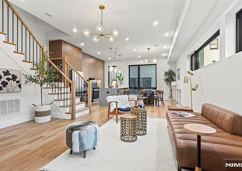Discover sophisticated urban living in this stunning duplex at 32 Hancock in The Heights. This meticulously designed 3-bedroom, 2.5-bathroom residence offers an unparalleled blend of modern luxury and comfort. Step into a chef's dream kitchen, featuring top-of-the-line Samsung appliances, a breathtaking waterfall center island, and exquisite two-tone cabinetry adorned with elegant gold hardware. Throughout the home, you'll find a consistent theme of refined gold accents that complement the gleaming hardwood floors. The entertaining level also boasts a convenient powder bathroom with crisp white hardware and accents. The space is flooded with natural light from stylish black-framed windows, creating a bright and inviting ambiance. Enjoy seamless entertainment with built-in ceiling speakers, and experience ultimate comfort with a dual-zone HVAC system. Practical amenities abound, including an over-range pot filler for culinary convenience. The primary bedroom is a true retreat, offering a spacious walk-in closet and a luxurious ensuite bathroom. All bathrooms throughout the home feature modern lit and anti-fog mirrors, adding both style and functionality. Security and peace of mind are paramount, thanks to a Honeywell Home alarm system and a Ring video doorbell. Venture upstairs to your private rooftop oasis, where you'll be captivated by panoramic New York City views, perfect for entertaining or quiet reflection. The rooftop is further enhanced with speakers, gas, water, and e