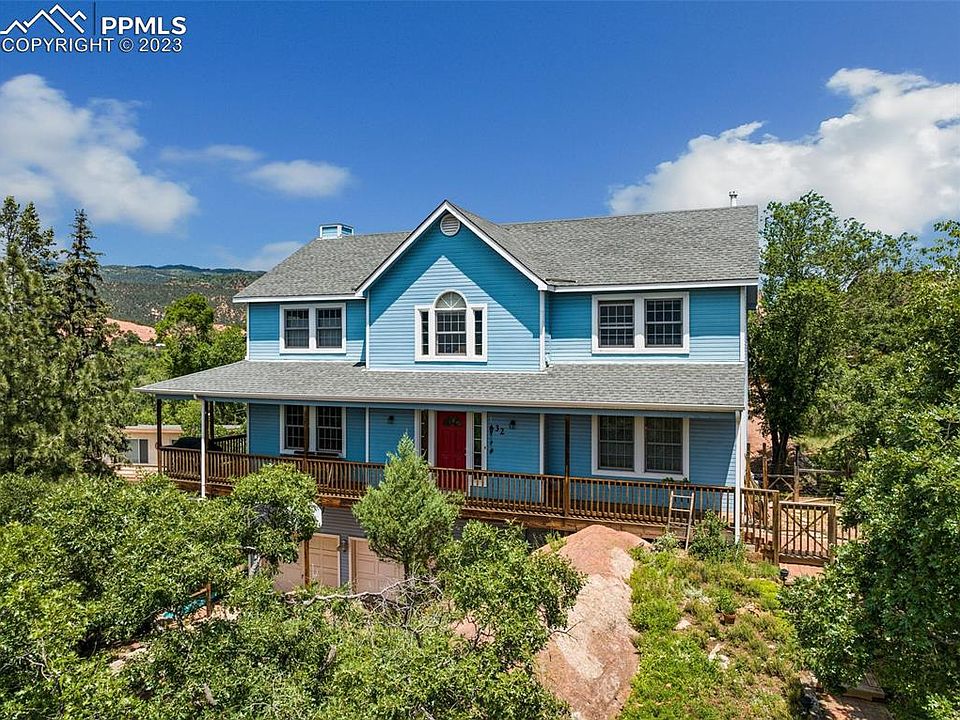 This stunning property offers breathtaking, panoramic views of Pikes Peak, the magnificent surrounding mountains, iconic Garden of the Gods, and Red Rock Canyon Open Space. Immerse yourself in the beauty of nature with rock formations right on the property and easy access to Garden of the Gods hiking, biking and horse trails. Nestled in a peaceful, well-established neighborhood, this residence provides the perfect retreat from the hustle and bustle of city life, yet offers convenient access to nearby amenities such as shopping, Manitou Springs and Highway 24. Step into the heart of this home and discover a completely updated chef's dream kitchen. The elegant quarter-sawn oak cabinets, gleaming stainless steel appliances, and luxurious granite countertops create an exquisite space for quiet meals or entertaining. A large pantry off the kitchen provides storage for all of your kitchen necessities and a manual dumb-waiter helps get things from one level of the home to another. The main level showcases the beauty of oak floors, adding warmth and character to the living spaces, and the gas fireplace in the Family Room creates a cozy ambiance for relaxing evenings. With almost 500 square feet of wrap-around porch, there's also plenty of room for outdoor living. The Primary Suite is a true sanctuary, featuring a beautifully updated en suite bathroom with a soaking tub, hardwood cabinets, and finished with leathered-granite counters and maple flooring. Enjoy the ultimate indulgence with a private balcony providing unparalleled views of Pikes Peak and Garden of the Gods. The main floor bathroom has just been updated, and the exterior boasts a fresh coat of paint and a new roof! Don't miss the chance to make this your forever home, where tranquility, Colorado’s natural beauty, and modern comforts seamlessly merge.