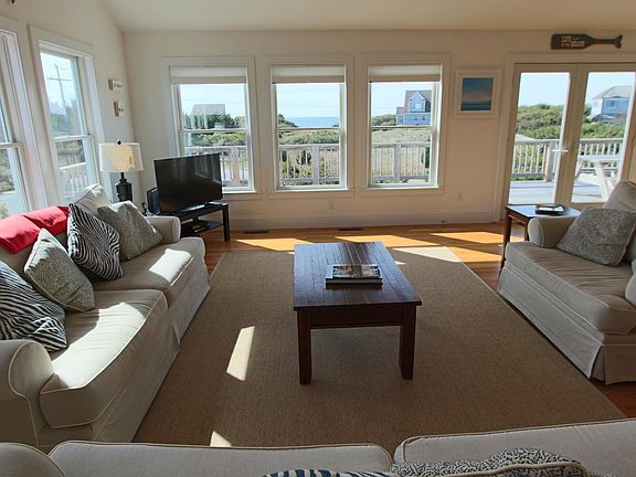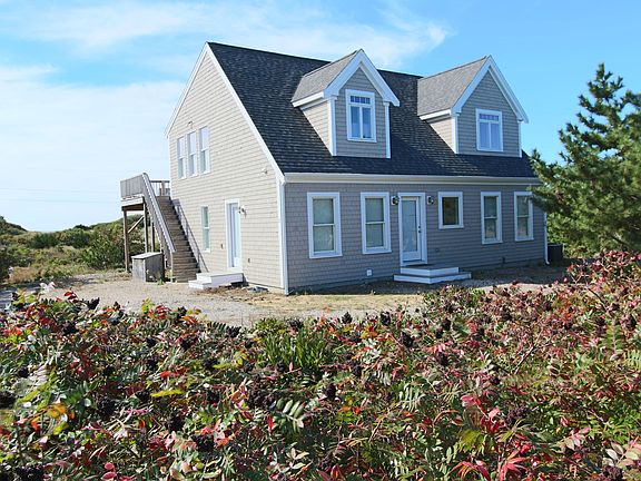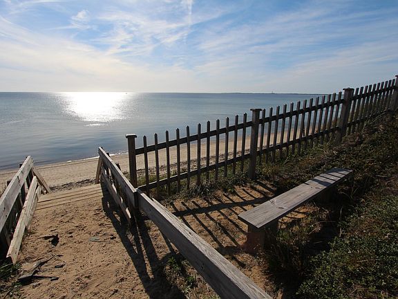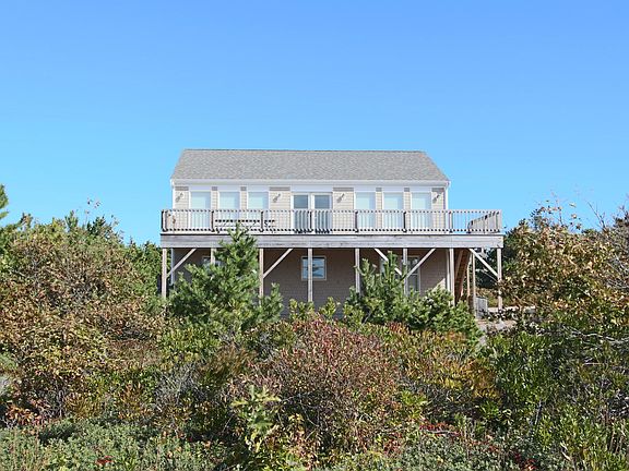 Beautiful Contemporary Cape with views of Cape Cod Bay and across the street from the private association beach. This pretty upside down home has a second floor that's wide open with walls of windows to capture every bit of light and maximize the wonderful views. The vast space encompasses an exquisite comfortable living area with vaulted ceiling. It flows beautifully into the simple but formal dining area and nicely designed kitchen with granite counter tops and stainless steel appliances. French doors open to an enormous deck that faces the water. Ideal for sunbathing, relaxing and enjoying cookouts as you take in the views. The first floor has 2 plus bedrooms, full bath and a master suite with stunning master bath. An outside shower is the icing on the cake.