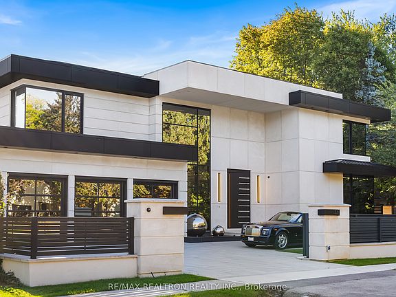 Gated Modern Masterpiece in Prestigious Bayview Glen. A striking showpiece in the exclusive Bayview Glen community, this estate is defined by bold design and uncompromising luxury. The exterior pairs Indiana limestone slabs with ACM panels, European aluminum tilt & slide windows, and a lifetime metal roof. Remote-access security gates and an 11-foot European pivot door create a dramatic first impression. Inside, soaring 24-foot ceilings define the family room, anchored by a marble fireplace and framed by floor-to-ceiling windows with integrated speakers. A floating glass staircase and elevator connect all three levels. Comfort is unmatched with heated main and lower levels, plus heated garages, driveway, steps, walkways, and pathways leading to the cabana. The chefs kitchen offers custom cabinetry, Thermador appliances, a Gaggenau wine cooler, and a waterfall island with leathered marble countertop, complemented by a full prep kitchen. The formal dining room is highlighted by an illuminated onyx wall and designer chandelier, while the living room boasts a backlit onyx fireplace as a dramatic focal point. The primary suite is a private sanctuary with boutique walk-in closet, balcony, fireplace, and spa-inspired ensuite with steam shower. In total, the home offers 5+1 bedrooms and 10 bathrooms. The entertainers lower level features a 26-foot bar with Mario Romano backsplash, 7.2 Dolby Atmos theatre with 150 screen and skylight, wine cellar, nanny suite, fitness room with steam sauna, and a spacious lounge with 100 fireplace and walk-up to yard. Outdoors, southwest exposure frames a resort setting: a Todd saltwater pool, Jacuzzi with independent controls, cascading waterfall with gas fireplace and heated pathways. The cabana doubles as an outdoor kitchen with barbecue, fridge, cabinetry, outdoor TV, shower, 2-piece bath, and built-in speakers. An LA-inspired showpiece in Bayview Glen, blending contemporary design with world-class finishes.