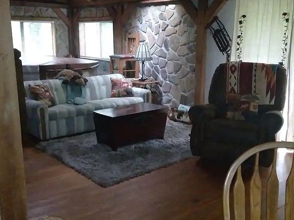 Take it easy at this unique and tranquil getaway. This newly remodeled gem is tucked perfectly in the center of a circular driveway which is surrounded by complete serenity in the woods. There is a fire pit with a sitting area which is the perfect spot for roasting marshmallows or sipping a glass of wine. The cabin has a cozy, warm feeling like being at home! There is also an indoor hot tub to relieve the tensions from your every day life! The back porch is a great place for your morning coffee
