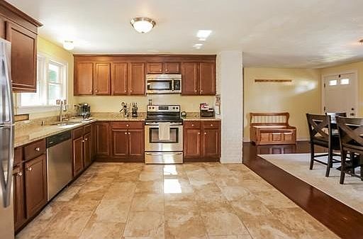 Summer time and the living is easy! If you are quick, 32 Lester will be your new address. Tastefully remodeled in 2011 from the studs out, this three bedroom California style Ranch features newer kitchen w/cherry finished cabinetry, stainless steel appliances, tile floor and granite tops. Dining area off kitchen w/bow window. Front to back family room w/fireplace and ceiling fans. The electrical, plumbing, heating and windows have all been recently updated. Maintenance free exterior, nothing left to do but move in. Large stamped patio designed for entertaining. Shed (man cave) with electricity. Impeccably kept home!!