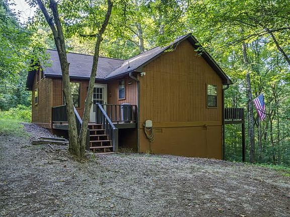 COME TO THE MOUNTAINS TO FISH, SWIM, AND PLAY IN THIS SMALL GATED COMMUNITY OF CABINS WITH A COMMUNITY CREEK AND POND! Two bedrooms and two completely remodeled baths with walk in tiled showers. Large great room with cathedral ceilings, wood floors, stone fireplace with gas logs or can change out to wood burning. Enjoy the grilling decks or sit on the screened porch to watch the deer run through your yard. Yard has been done naturally for easy maintenance. Use cabin as vacation rental, full time living, or summer home. Area is quiet and peaceful. Home is clean and well maintained. New roof in 2020 and new HVAC System in 2016.