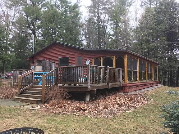 Great log cottage on a wonderful level lot. Screen porch across the entire front of the house with a deck on the side. Nice cozy interior with stone fireplace, and open living, dining and kitchen area. Small but adequate bed rooms and bath + outdoor shower, full basement with furnace and work shop area. Includes a WATER FRONT LOT right across Lake Shore Dr. around 50 feet with a place for your dock and your water toys. Use the association beach and golf at the pitch and putt. Gotta see this one.