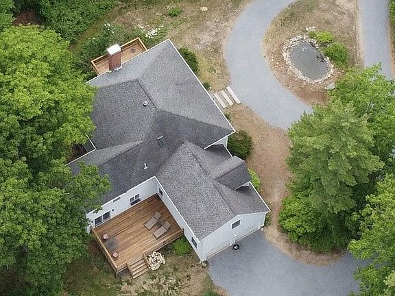 Peacefully tucked away in a tranquil wooded setting and only 10 minutes from the center of town, this handsome retreat offers custom features and exceptional comfort in lush, natural surroundings. Situated on 4.18 very private acres of diverse vegetation that include orchards, perennial plantings, stone outcroppings and a man-made pond with water lilies. Select Canadian oak floors, cathedral ceilings, architectural windows and skylights enhance a bright, sun-filled interior throughout this elegant hip-roofed colonial that features a large welcoming eat-in granite kitchen with Viking range and breakfast island. Decorative wainscoting punctuates the main level that includes a generous-sized living room with wood-burning fireplace and formal dining room. Two separate stairways access the upper level with spacious bedrooms, a full master suite, an open library / loft area with built-ins and a bonus room/office. Mahogany decks overlook the yard from opposite sides of the house affording both morning and afternoon sunlight exposure and providing outdoor space for relaxing or entertaining friends and relatives while a newly carpeted walk-out basement with wood-burning stove offers additional recreational space. Outdoor enthusiasts will appreciate the location as it is a great area for hiking, dog-walking or cross-country skiing.