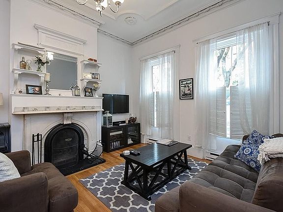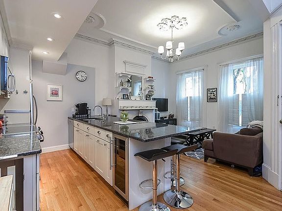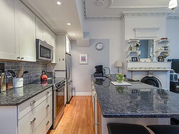 This condo was fully renovated in 2006. Parlor level with 12' ceilings, original moulding, subway tile and marble floor in bathroom, loft storage, working fireplace, deck, stainless steel appliances, granite counter tops, tile backsplash, solid maple cabinets