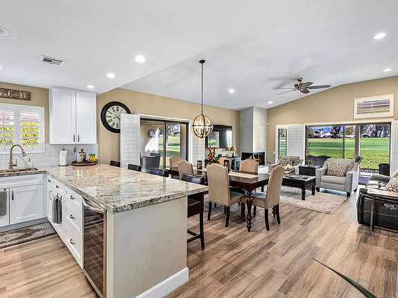 Beautifully remodeled, furnished 2 bed / 2 bath condo located on the 16th fairway of the Dinah Shore Championship course in Mission Hills Country Club. As you enter the home, your eyes are drawn to the vaulted ceilings, and beautifully reconfigured/remodeled kitchen. The patio off the dining area is perfect place to relax and enjoy the multiple fairway and mountain views. Both bedrooms are well proportioned and have sliding doors providing access to the outdoor patio spaces. Private large back patio with a pergola provides privacy and a great space to entertain. The attached garage is large enough to accommodate two cars, golf cart & plenty of storage space. Steps from the community pool & spa. Mission Hills HOA includes landscaping, guard gates, community pools, exterior maintenance of roofs and painting. Plus 3 championship golf courses - Arnold Palmer, Pete Dye Challenge, & Dinah Shore Tournament. Minutes away from Palm Springs Airport, Eisenhower Medical, The River and Agua Casino & entertainment. Private golf, social and tennis/pickleball/gym memberships are available at the MHCC, a golf cart ride away. Low monthly HOA fee and the land lease extension to 2121 has been paid in full. Start enjoying your desert lifestyle today.