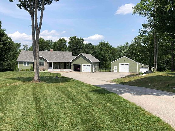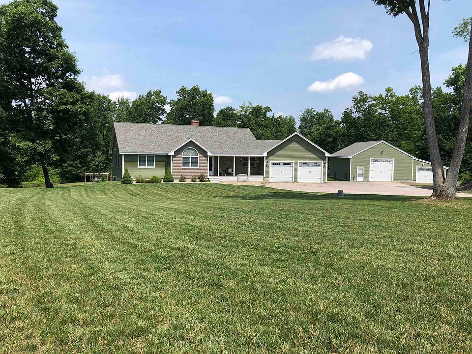 Located on a cul-de sac with just 4 lots this ranch style home has a lot to offer. There is a large garage it is approximately 28X40 for work vehicles or large toys, also attached is a smaller garage with double sided doors for easy access for all the smaller toys or use as storage. The home offers 3 bedrooms with 2 baths, ensuite in Primary bedroom with walk in closet. Hardwood floors in main living area. The lower level is finished, great area for movie theatre or game room. There is also an abundance of storage space. Sliders lead to the patio and backyard area. The 3rd bedroom is located in the lower level. There is also a pellet stove for a little extra warmth. Vaulted ceilings in the combined kitchen and living area. A large kitchen island offers a multitude of storage space, plenty of room for everything. Located right off the kitchen is a spacious deck, enjoy the warm summer nights or take a dip in the pool. No need to worry if you have animals the whole back yard is fenced in. If you do have toys, there is a trail out behind the garage leading to a round track or head to the pond and do a little fishing. This home and property have a lot to offer and it is all set on 12 + acres. Come have a look Owner is listing agent All offers due Wed. 7/20 by 12pm.