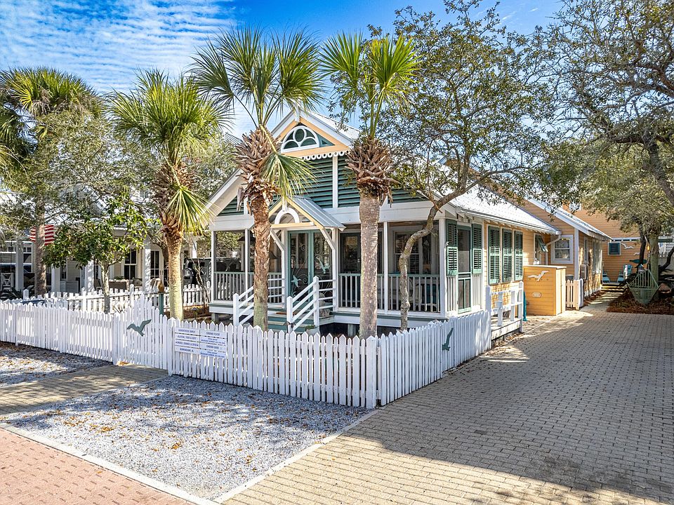 It's location, location, location! Nestled three lots back from iconic scenic 30A, these immaculately maintained beach cottages are a stone's throw from the beach, with the west-end family pool in the opposite direction.The one-level main house offers easy living with three bedrooms, two and a half baths, a vaulted ceiling, and a fireplace for cozy coastal nights. Updated bathrooms and kitchen defy the one-of-a kind vintage Florida charm of this much-loved beach home. A bunk room with four bunks, and the guest bedroom share a Jack & Jill bathroom. A well-placed skylight floods the common bathroom with sunlight. The master suite's bathroom has been lovingly remodeled with a separate shower and soaking tub to satisfy everyone's whim. The generous front screened porch is the perfect spot to relax and visit with neighbors as they stroll to the beach. With high ceilings, ceiling fans, and beautiful vintage wicker furniture, it's an inviting space that blends comfort with timeless style. Whether you're people watching, or enjoying a glimpse of the iconic Truman House just across the street, this porch offers the ideal place to unwind. A large attic offers plenty of storage space. And, got beach toys? Keep them securely stowed away in one of several outdoor storage units. Plenty of deck space connects the main house to the guest cottage and creates an outdoor living area. An over-sized driveway can comfortably accommodate a couple of vehicles.