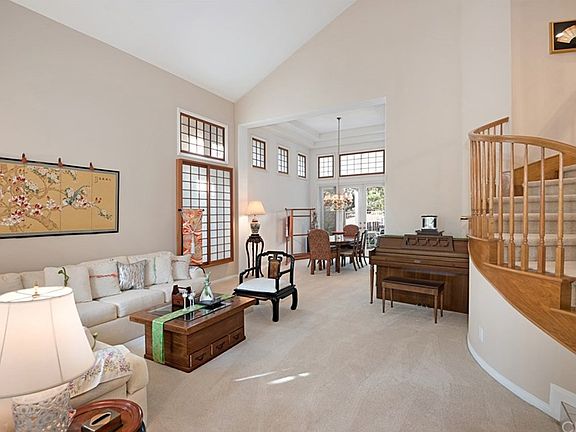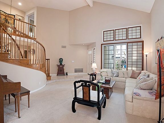 This beautiful home is located in one of the best areas of Laguna Niguel. It has a private entry courtyard which leads you to the homes entrance. The step down and open living room and dining room areas have high windows and vaulted ceilings which let in lots of natural light and is designed for entertaining on a grand scale or for large family events. The home also features a large kitchen adjacent to a large and cozy family room with a wood burning fireplace. There is also a bedroom and bathroom on the entry level and indoor laundry room with additional sink. At the top of the beautiful curved stairs is and oversize master bedroom and private bathroom with separate shower and large soaking bathtub. Down the hallway are 2 additional spacious bedrooms, a bathroom and an extra large bonus room. The upstairs has a viewing balcony that is accessible from one of the secondary bedrooms and the bonus room. The quiet backyard has a putting green and patio area. This home has a 3 car garage and ample driveway. It is located near the end of the quiet cul de sac in the desirable San Marin community. Close to the beach, walking trail, shopping, great restaurants and luxury movie theater, this home is California living at its finest.